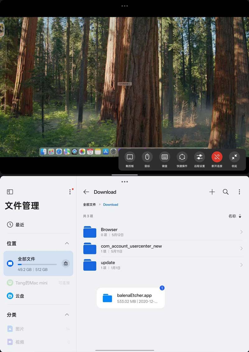 O+互联还有一个绝活,如果你的平板已经连上远控的Mac电脑,然后进行分屏操作,还可以把电脑上的文件,拖拽到平板上,轻松丝滑十分方便。