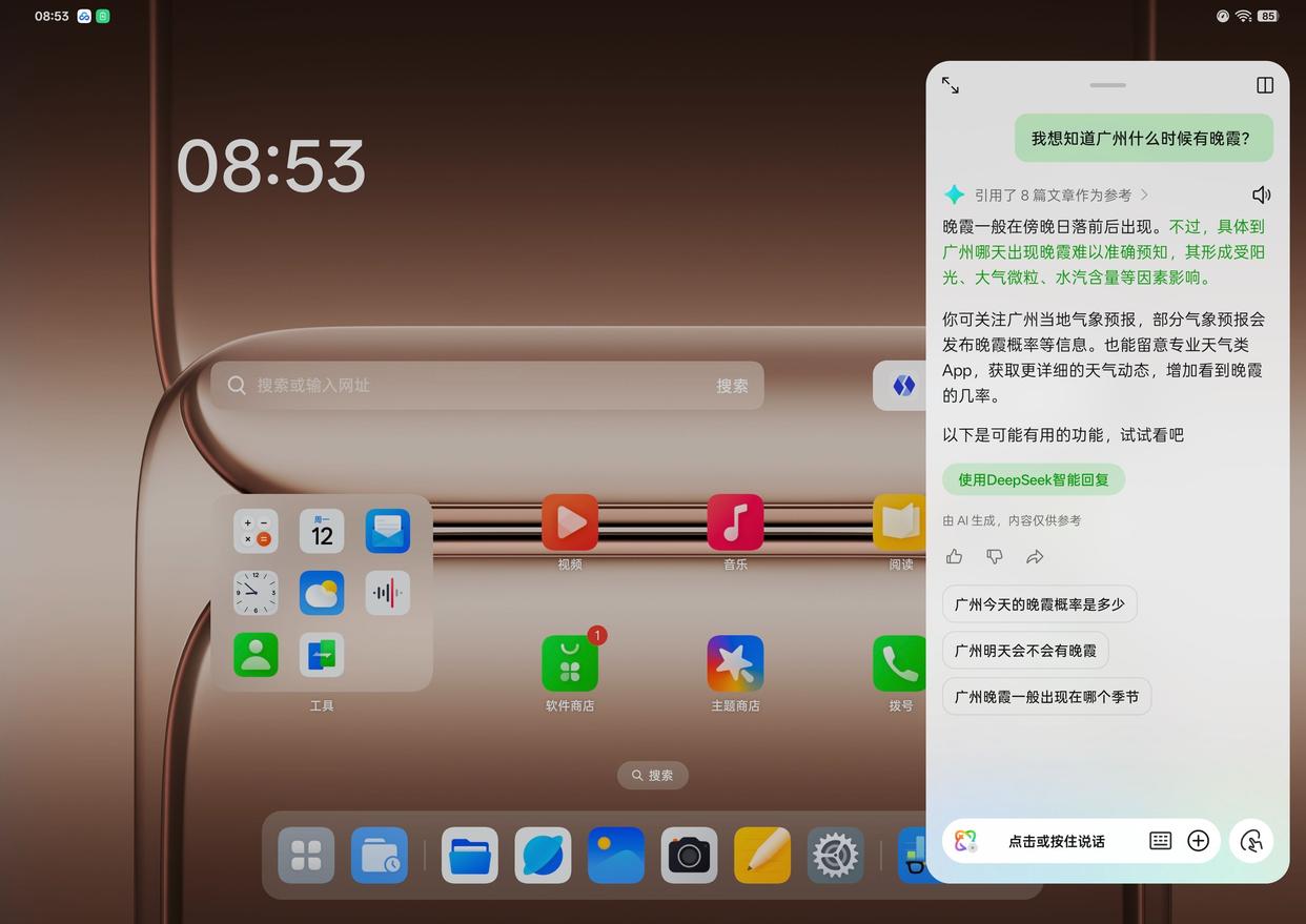 另外,ColorOS 15也带来了非常多的AI新体验,小布助手也升级到了“超级小布助手”,深度接入了DeepSeek-R1大模型,可以通过语音就能进行深度思考,一键问屏等等。还有文档AI助手、AI语音摘记、同传等功能可以让大家去挖掘,反正就是给你提高了非常多的办公效率了。