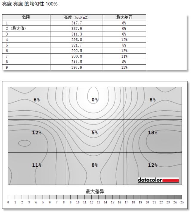 亮度均匀性的测试中,HKC T2755U显示器整体表现也不错,亮度最大为第2象限,最大差异在第6象限,差值为45.4cd/m²。