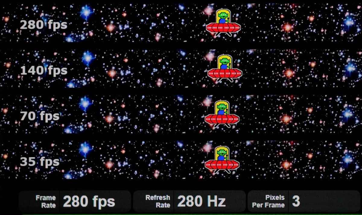 接下来我们用UFO TEST测试屏幕的刷新率,通过相机抓拍的情况来看,显示器没有出现跳帧情况,说明其支持280Hz输出。由于OLED面板在响应速度方面的天生优势,在拖影测试中。可以看到显示器的屏幕响应表现完美,280Hz下快速运动的UFO完全没有任何拖影和模糊的现象。