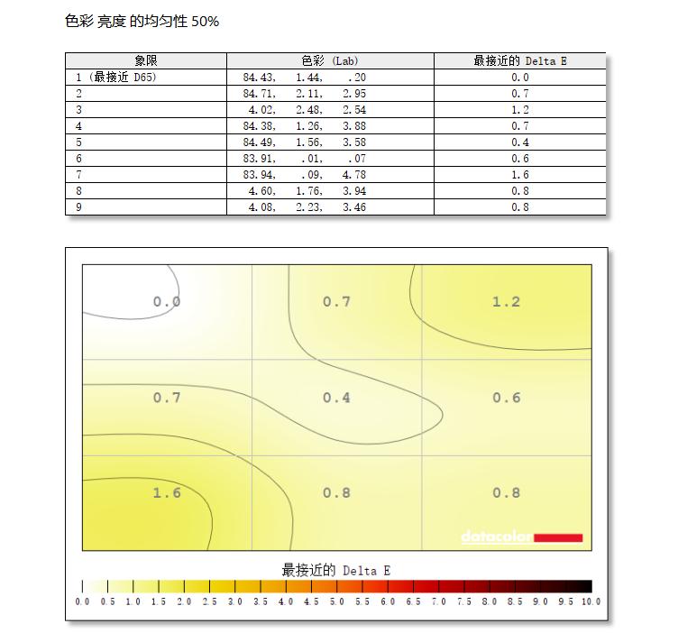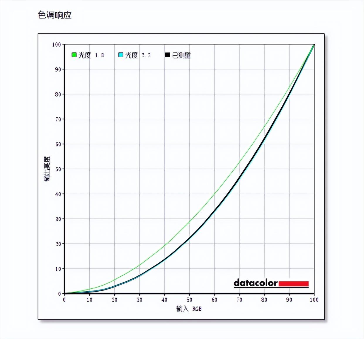 由于OLED面板自发光的特性,在屏幕一致性方面具有天然的优势,在色彩亮度均匀性的测试中,可以看到50%亮度下,屏幕最大差异值都在Delta E 1.6以内,显示器整体的均匀性表现相当不错,并且OLED屏幕不存在漏光的问题,实际使用表现会远超传统的LCD屏幕。色调响应方面,这款显示器的实测色调响应符合Gamma2.2曲线,表现优秀。