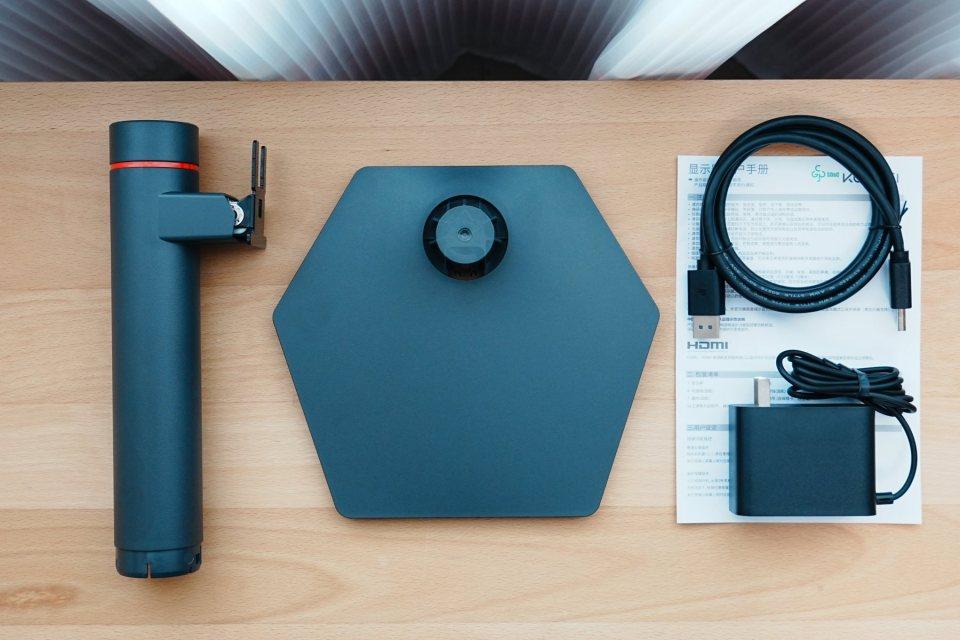 所有配件如上图,底座、支架、HDMI数据线一根,集成电源一个,简易说明书一本。