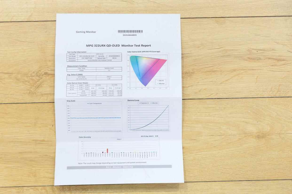 作为高端电竞显示器,每一台微星MPG 322URX QD-OLED出厂时都有独立校色,并提供相应的校色报告,可以看到显示器的序列号,具体参数,色域,色彩还原表现等一系列专业数据。