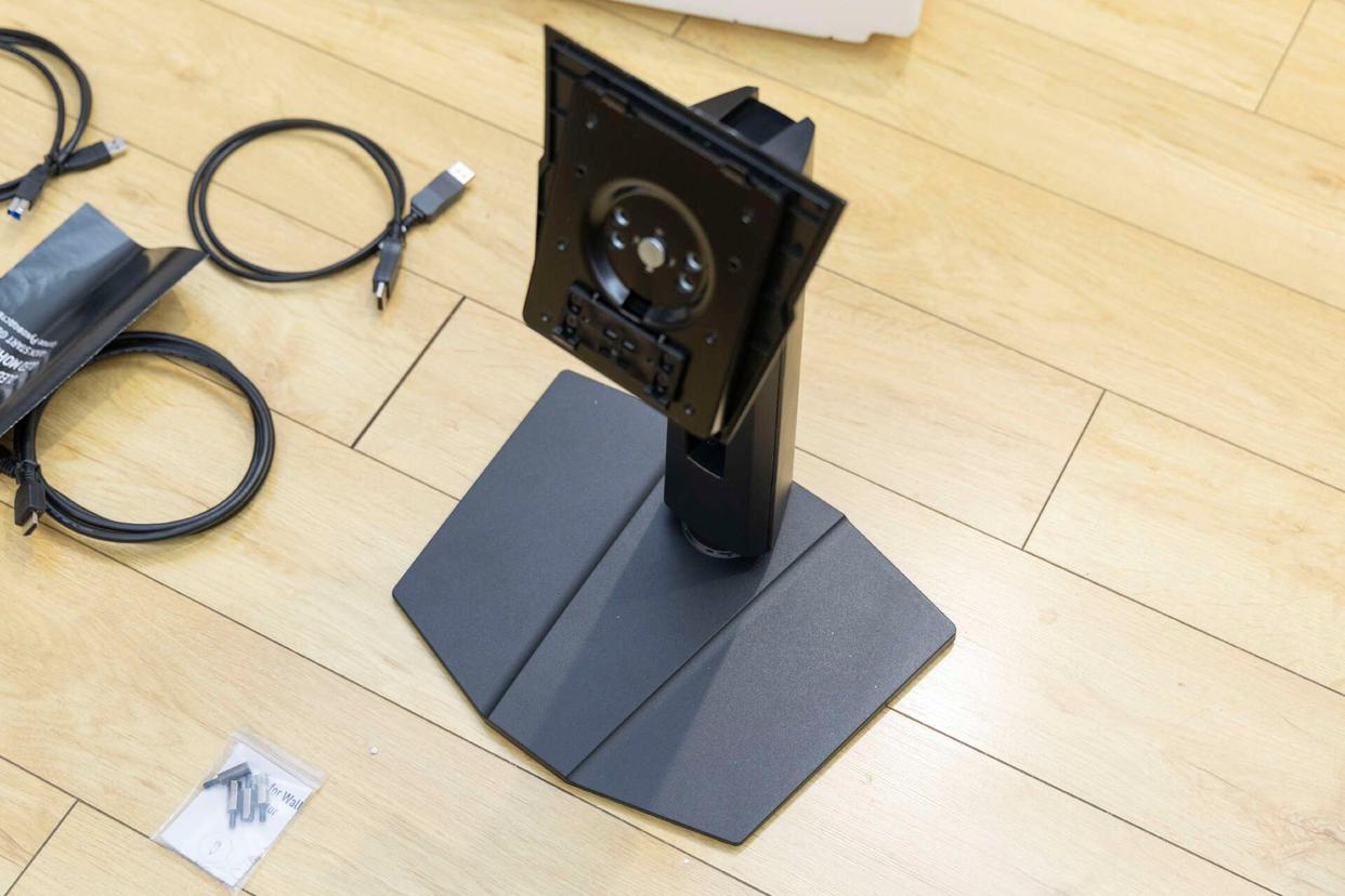 显示器的底座采用了简约的设计风格,底座和支架臂均为全金属材质,通过免工具螺丝可以快速组装。