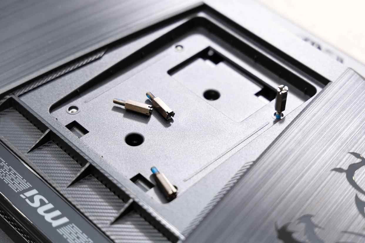 显示器的背面采用的是全金属框架加上经典小背包设计,内置石墨烯散热器并在背包顶部和侧边设置大量散热栅格,能保证显示器长时间稳定运行。背包外壳采用了金属拉丝工艺,配合MSI亮面龙纹,多重材质的组合极具高级感。