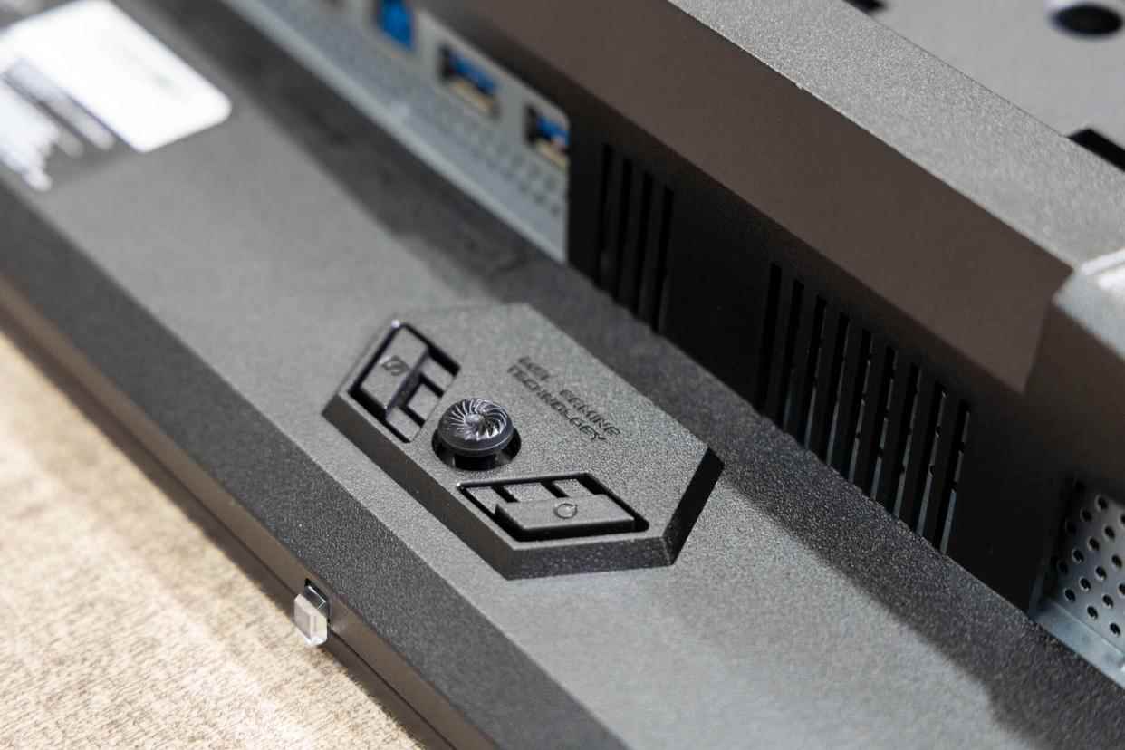 微星MPG 322URX QD-OLED采用的内置电源设计,IO面板位于机身背部背包的下方,呈左右两段式布局。