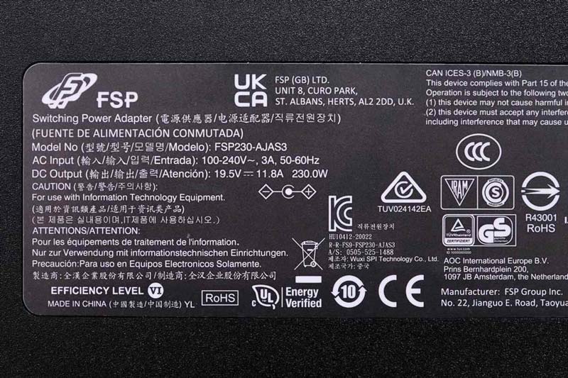 AGON AG276UZD QD-OLED显示器的适配器由FSP全汉代工制造,具备230W的强劲功率,其电源规格为19.5V和11.8A。该适配器的AC输入兼容100V至240V电压,确保了在全球各地的通用性。