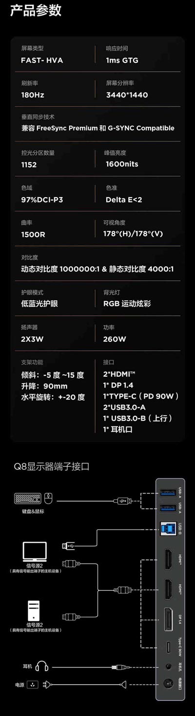 该显示器配备 3440x1440 分辨率 21:9 比例 180Hz Fast HVA 面板,曲率 1500R,显示器配备 2304 颗灯珠,拥有 1152 分区,峰值亮度 1600 尼特,静态对比度 4000:1,支持 10-Bit 色彩(8-Bit + FRC),覆盖 97% DCI-P3、95% Adobe RGB、99% sRGB 色域。