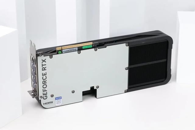 将影驰GeForce RTX 5060 Ti星曜NOX OC显卡翻转过来,可见其底部设计亦独具匠心,采用了独特的镜面背板加以装饰,并强化整个显卡的刚性——由304不锈钢材质制成的金属背板表面经抛光、电镀处理之后尤为光滑,不仅能够反射出主机内其他硬件的绚丽灯光,还能巧妙地将周围环境的光影融入其中,使整个显卡成为主机内灵动的艺术载体。此外,影驰GeForce RTX 5060 Ti星曜NOX OC的尾部还预留了大面积的散热鳍片,有助于内部废热的散发。