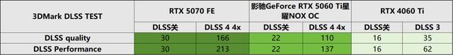 在对RTX 4060 Ti与影驰GeForce RTX 5060 Ti星曜NOX OC进行比较分析时,除了核心性能和显存配置存在客观差异外,二者在技术特性支持方面也呈现出显著的差异性——影驰GeForce RTX 5060 Ti星曜NOX OC所具备的多帧生成技术,是RTX 4060 Ti所不具备的。为此,我们通过3DMark DLSS TEST进行帧率方面的简易测试。测试结果显示,在未启用DLSS的情况下,影驰GeForce RTX 5060 Ti星曜NOX OC在测试场景中的帧率未超过30fps。然而,当切换至DLSS 4@质量模式后,帧率迅速跃升至100fps以上,相较于原生帧率实现了超过400%的增长幅度,并且相比仅支持DLSS 3的RTX 4060 Ti,二者之间的帧率差距得以大幅拉开。将DLSS 4的提升效果拓展至实际游戏场景,影驰GeForce RTX 5060 Ti星曜NOX OC有望在支持DLSS 4的游戏中,为玩家提供更为流畅、帧率更高的游戏体验。