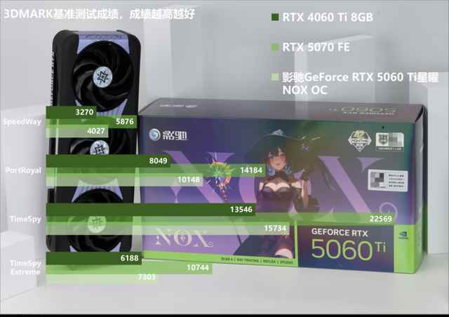 从FireStrike测试结果综合来看,影驰GeForce RTX 5060 Ti星曜NOX OC较RTX 4060 Ti在理论性能方面平均约有27%的提升。作为对应位置迭代的产品,前者的表现值得认可。在其余的Timespy、PortRoyal、SpeedWay测试中,影驰GeForce RTX 5060 Ti星曜NOX OC呈现出明显优势,其综合性能平均领先RTX 4060 Ti达20%以上。特别是在侧重于全局光线追踪效能的3DMark SpeedWay测试中,领先幅度进一步扩大至26%,彰显了该显卡在光线追踪场景下的优秀处理能力。