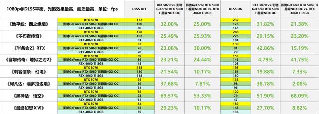 在1080p分辨率下,影驰GeForce RTX 5060 Ti星曜NOX OC在光追游戏中的表现明显优于RTX 4060 Ti。在关闭DLSS功能的情况下,其平均帧率领先幅度达到21%;而启用DLSS后,这一优势进一步扩大至24%。特别是在《黑神话:悟空》《龙腾世纪:影障守护者》等对硬件性能要求较高的游戏中,该显卡的帧率提升幅度普遍超过30%,彰显了其不俗的光追优化能力。