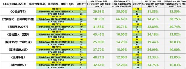 在1440p分辨率下运行支持光线追踪的3A大作时,显卡性能需求显著提升,这一点在本次测试结果中得到了充分的体现。具体而言,部分游戏在关闭DLSS技术的情况下,即便是RTX 5070这样的显卡也难以保持稳定流畅的帧率,必须借助DLSS技术才能确保游戏的可玩性。这一现象直接导致了参测的三款显卡在性能上的差异在测试过程中被进一步放大。