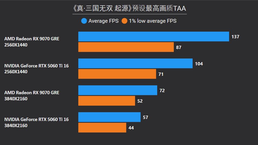 首先在这俩卡的主战场2K分辨率,RX 9070 GRE平均下来可领先26%,领先幅度最大的是《沙丘:觉醒》和《永劫无间》,分别达到41%和59%,确实是碾压般的存在,领先幅度最小是《剑星》只有6%,而《CS2》是RTX 5060 Ti唯一能制胜的项目,不过它的领先幅度只有5%。