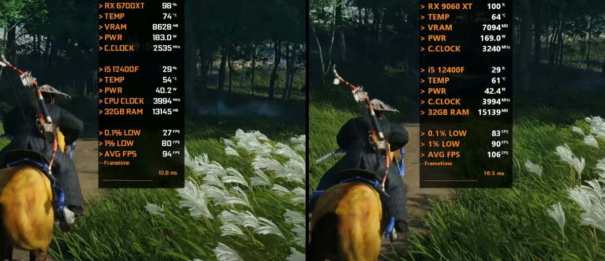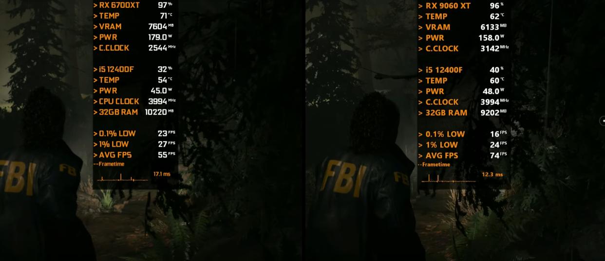以下将分别测试七款游戏,均采用1080P画质模式,以下系列图片中左边代表Radeon RX 6700 XT 12GB平台,右边代表Radeon RX 9060 XT 16GB平台。