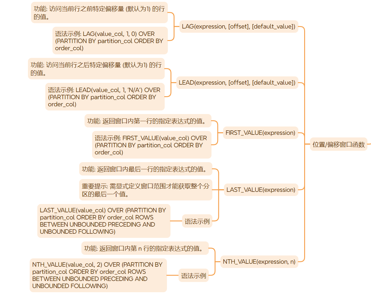 PARTITION BY: 分区子句。将数据集逻辑上分割成多个独立的组(分区),窗口函数在每个分区内部独立计算。若省略,整个结果集被视为单个分区。ORDER BY: 排序子句。它定义了分区内各行的处理顺序。对于排名和位置函数,此子句至关重要。windowing_clause: 窗口范围子句。它更精确地定义了计算窗口的边界(例如ROWS BETWEEN 1 PRECEDING AND 1 FOLLOWING表示当前行、前一行和后一行)。如果省略(但有ORDER BY),默认通常是RANGE BETWEEN UNBOUNDED PRECEDING AND CURRENT ROW。