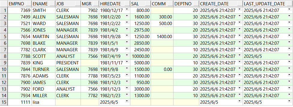 drop table EMP_TAR; drop table emp_source; create table emp_source as SELECT e.*,SYSDATE create_date,SYSDATE last_update_date from emp e; INSERT INTO emp_source(empno,ename,hiredate,create_date,last_update_date) VALUES(1111,'lisa',TRUNC(SYSDATE)-1,TRUNC(SYSDATE)-1,TRUNC(SYSDATE)-1); UPDATE emp_source SET sal=10000,last_update_date=TRUNC(SYSDATE)-1 WHERE empno=7788; commit; SELECT * FROM emp_source;
