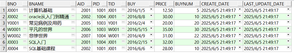 insert into book values('J0004','SQL基础课程',2002,1001,'J001',date '2016-6-6',28,10);