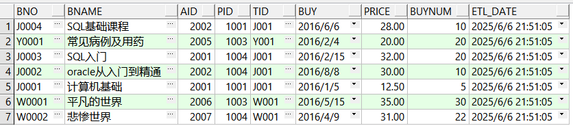 -- 没有匹配到数据,是新增数据 begin p_BOOK_SOURCE_TARGET(P_DT => trunc(SYSDATE) - 1); -- 传入昨天的日期 end; SELECT * FROM BOOK_TARGET;