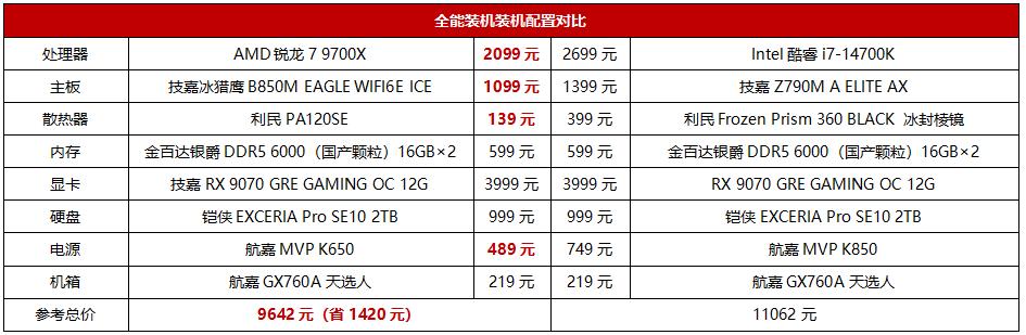 在游戏性能有优势的前提下,锐龙7 9700X因为较低的满载功耗,即便是百元风冷即可压制其散热,千元价位的B850主板就能满足其性能充分释放的需求。具体装机配置方面,我们罗列了两套典型配置进行对比,可以看到由于锐龙7 9700X平台的价格优势,它这套整机价格相对酷睿i7-14700K整机有着1420元的价格优势,性价比方面可以说更加优秀。