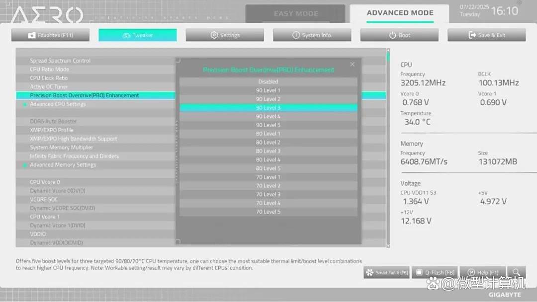 测试中,所有处理器都将使用技嘉主板特有的Precision Boost Overdrive Enhancement(PBO增强功能),该功能既可以开启处理器的PBO功能,又可对处理器的电压、功耗进行控制,保证处理器的TDP不超过标称规格,比如所有锐龙线程撕裂者的功耗都限制在最高350W,让用户兼得性能与低能耗。技嘉主板提供了大量不同等级的PBO加速选项,从70 Level 1到90 Level 5。前面的数字指的自然是温度,意味着允许处理器达到的最高工作温度。