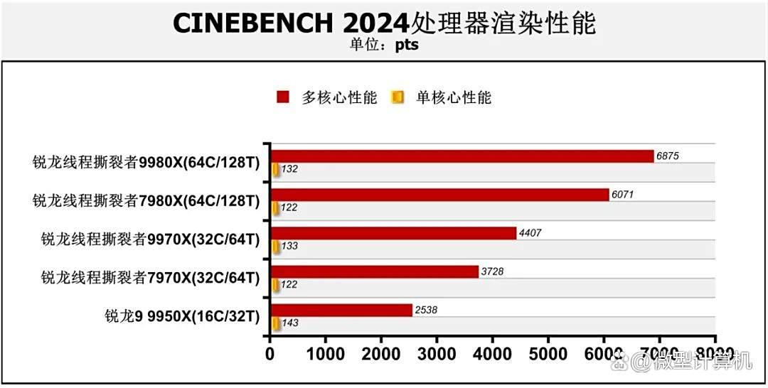 到了最新的锐龙线程撕裂者9980X、锐龙线程撕裂者9970X,得益于Zen 5架构的采用,它们则将单线程性能得分提升到850分以上,其单线程性能相对锐龙线程撕裂者7980X、锐龙线程撕裂者7970X分别提升10.8%、8.6%。而锐龙9 9950X由于核心数量少,最高加速频率达到5.7GHz,因此它的单线程性能表现更胜一筹,获得了最高的868.1分。单线程性能的提升不仅能让处理器更快地执行各类单线程应用,其多线程性能也势必将得到大幅增强。