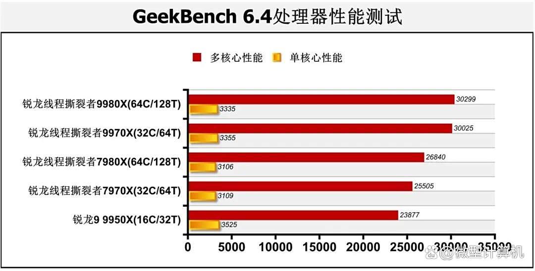这也导致最终在多核心性能上,它们也有很明显的差异。比如锐龙线程撕裂者9980X、锐龙线程撕裂者9970X的CINEBENCH 2024多核心渲染性能分别比锐龙线程撕裂者7980X、锐龙线程撕裂者7970X提升了13.2%、18.2%,锐龙线程撕裂者9980X、锐龙线程撕裂者9970X的GeekBench 6.4处理器多核心性能分别比锐龙线程撕裂者7980X、锐龙线程撕裂者7970X提升了12.8%、17.7%。