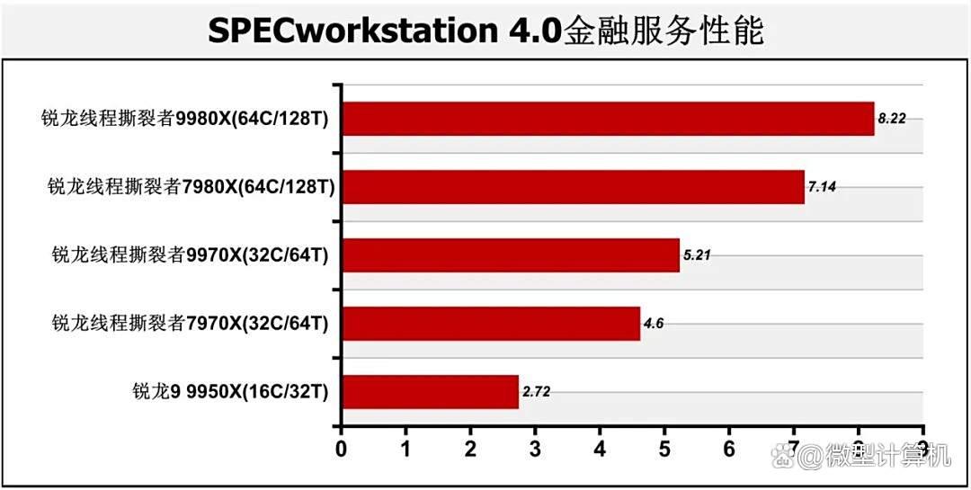 在金融服务测试中,该测试主要使用随机抽样运行蒙特卡洛模拟期权定价,使用微分方程评估期权定价的Black-Scholes模型,使用生成二项式树的迭代过程测试期权定价的二项式模型。同样在这些运算中也会调用远远超过64条的CPU线程参与运算,因此锐龙线程撕裂者9980X相对32核心锐龙线程撕裂者9970X领先了多达57.77%,相对同为64核心的上一代锐龙线程撕裂者7980X也有15.13%的性能优势。原因还是在于更多的处理器核心数量与Zen 5架构的结合,比如锐龙线程撕裂者9980X每秒可运行326255.87次蒙特卡洛模拟期权定价,而锐龙线程撕裂者9970X每秒的运行次数只有203168.47次,锐龙线程撕裂者7980X每秒的运行次数为281989.96,锐龙线程撕裂者7970X的每秒运行次数则只有176997.98。