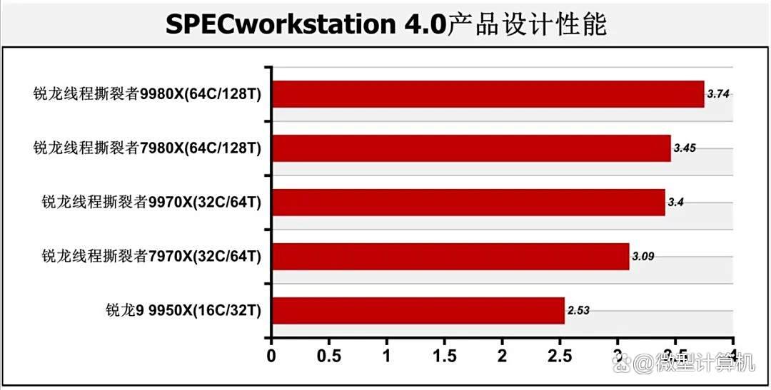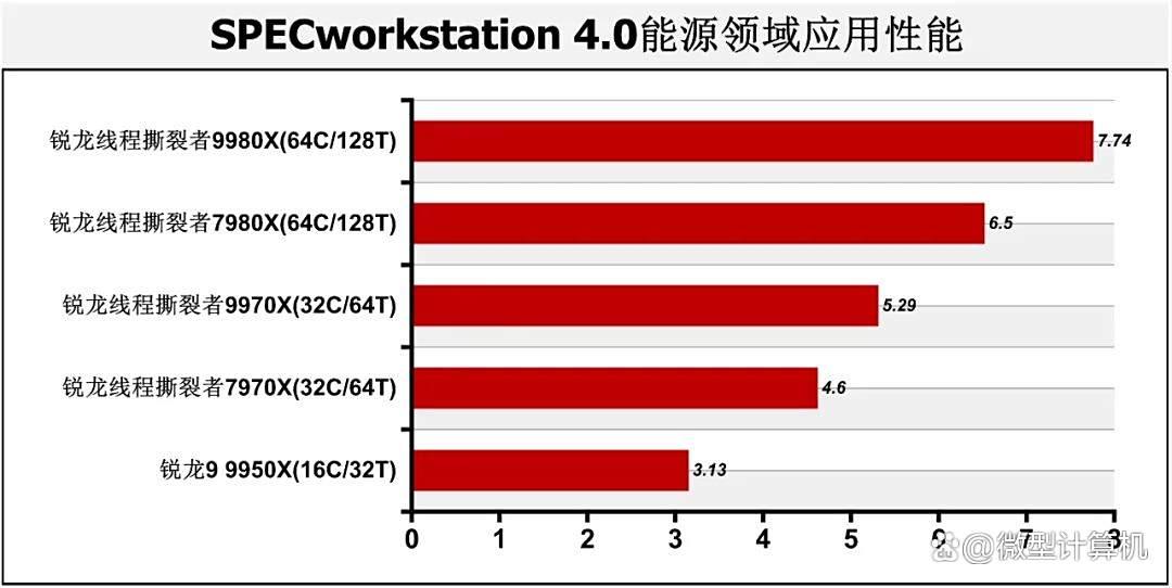 接下来就让我们通过实际应用测试来看看更强的处理器性能是否能在各类专业应用、软件中带来好处。因为锐龙线程撕裂者是为工作站打造的处理器,所以我们首先就使用SPECworkstation 4.0测试了各个测试平台在AI与机器学习、能源领域、金融服务、生命科学应用、媒体与娱乐行业与产品设计的性能表现。而锐龙线程撕裂者9980X在能源领域、金融服务、生命科学应用三个测试中能与其他处理器拉开非常显著的差距。比如在能源领域测试中,锐龙线程撕裂者9980X相对上一代的锐龙线程撕裂者7980X领先19%,相对同代但核心数少一半的锐龙线程撕裂者9970X也有46.3%的优势。这是因为能源领域测试中包括将卷积滤波器应用于图像的性能测试,用于模拟静电、热传导和流体流动的二维泊松方程求解,以及处理地震成像数据的地表相关多重预测性能测试(SRMP),而这些测试都能调动远超64条CPU线程参与运算。