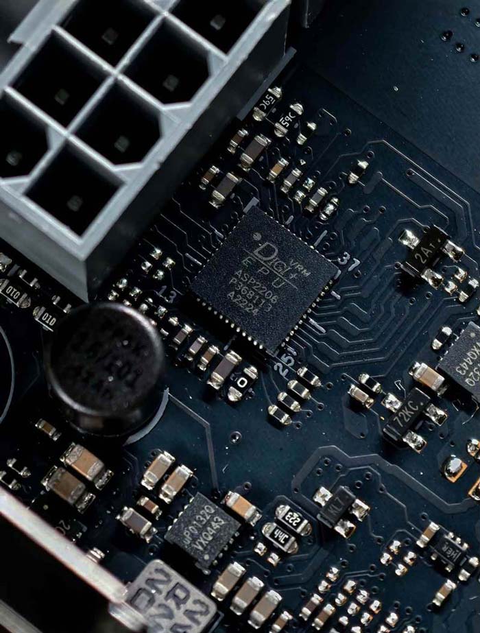 主板采用DrMOS MP86670,由MPS出品,具备80A高电流输出能力,顶部丝印的MPS2430为工厂内部批次码,非产品型号,常见于供电核心区域的高阶DrMOS。