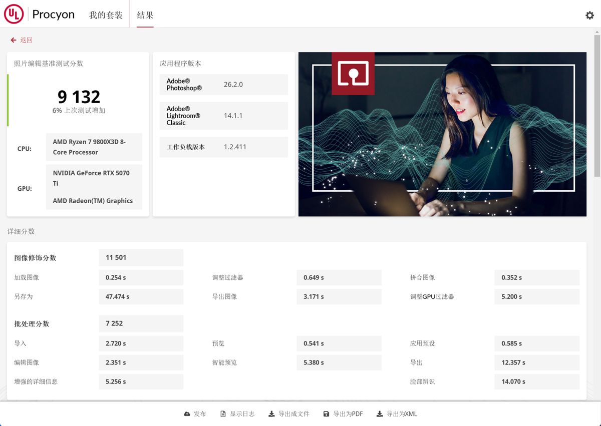 在 UL Procyon图像编辑实测中,R9 9950X3D与9800X3D总体差距极小,但得益于 9更多核心在线和更强批处理能力,9950X3D 在导出、智能预览等多线程任务上更胜一筹,适合重度摄影后期与内容创作者。