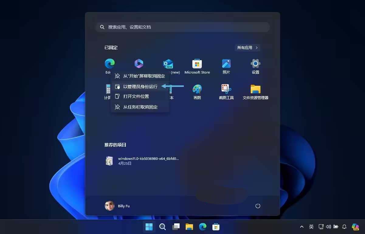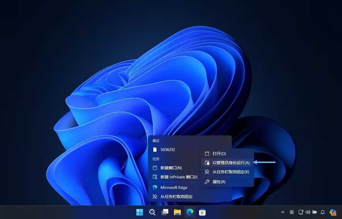 在「任务栏」的应用程序图标上,右键点击,然后再次右键点击应用名称,选择「以管理员身份运行」。