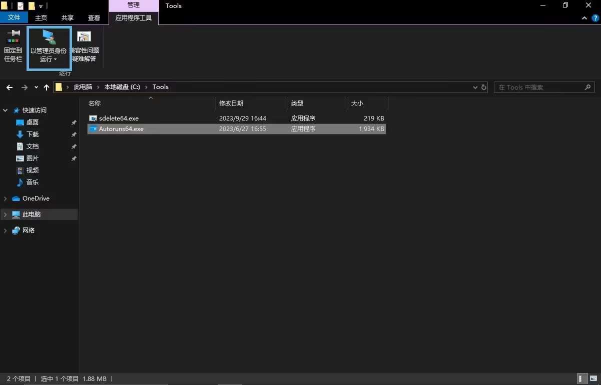 在「应用程序工具」选项卡,选择「以管理员身份运行」