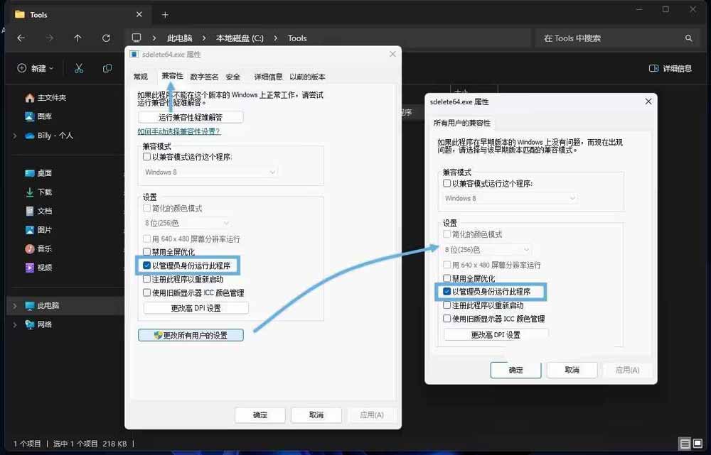 通过修改应用程序的「兼容性」属性,可以让程序永久以管理员身份执行:适用于快捷方式和可执行文件。