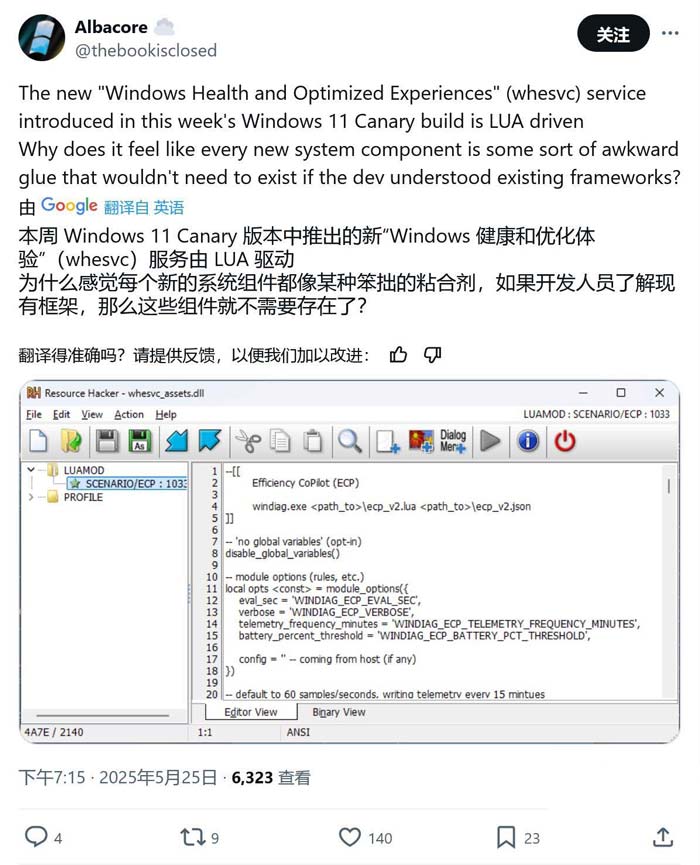 该功能由开发者 Albacore 率先发现,隐藏在 whesvc_assets.dll 文件中,采用轻量级编程语言 Lua 运行。