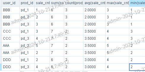 select *,sum(sale_cnt) over (partition by user_id),count(prod_id) over (partition by user_id),avg(sale_cnt) over (partition by user_id),max(sale_cnt) over (partition by user_id),min(sale_cnt) over (partition by user_id)from rows_test