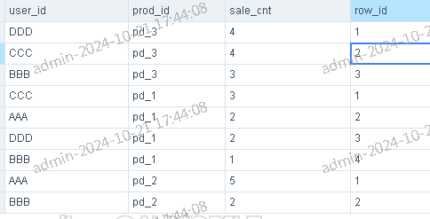select *,row_number() over(partition by prod_id order by sale_cnt desc) row_id from rows_test ;select *,rank() over(partition by prod_id order by sale_cnt desc) rank_id from rows_test ;select *,dense_rank() over(partition by prod_id order by sale_cnt desc) dense_rank_id from rows_test ;