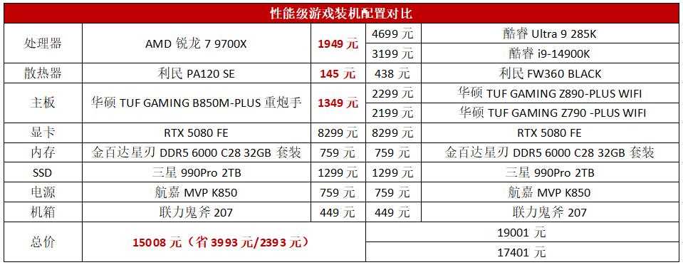 具体装机配置方面,我们罗列了两套典型配置进行对比,可以看到由于锐龙7 9700X平台的价格优势,它这套整机价格相对酷睿Ultra 9 285K整机有着3993元的价格优势,相对酷睿i9-14900K也有2393元的优势,性价比方面的优势也是尽显。无论从哪个方面来看,锐龙7 9700X非常适合想要打造高性能游戏主机的用户。