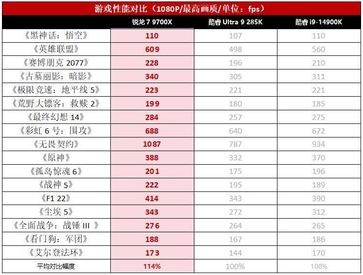 从实际的游戏测试结果来看,锐龙7 9700X的实际表现确实让人感到惊艳。虽说其最高频率不如酷睿Ultra 9 285K和酷睿i9-14900K,但是IPC性能出色的Zen5架构的加持下,游戏性能全面领先于两款竞争对手。