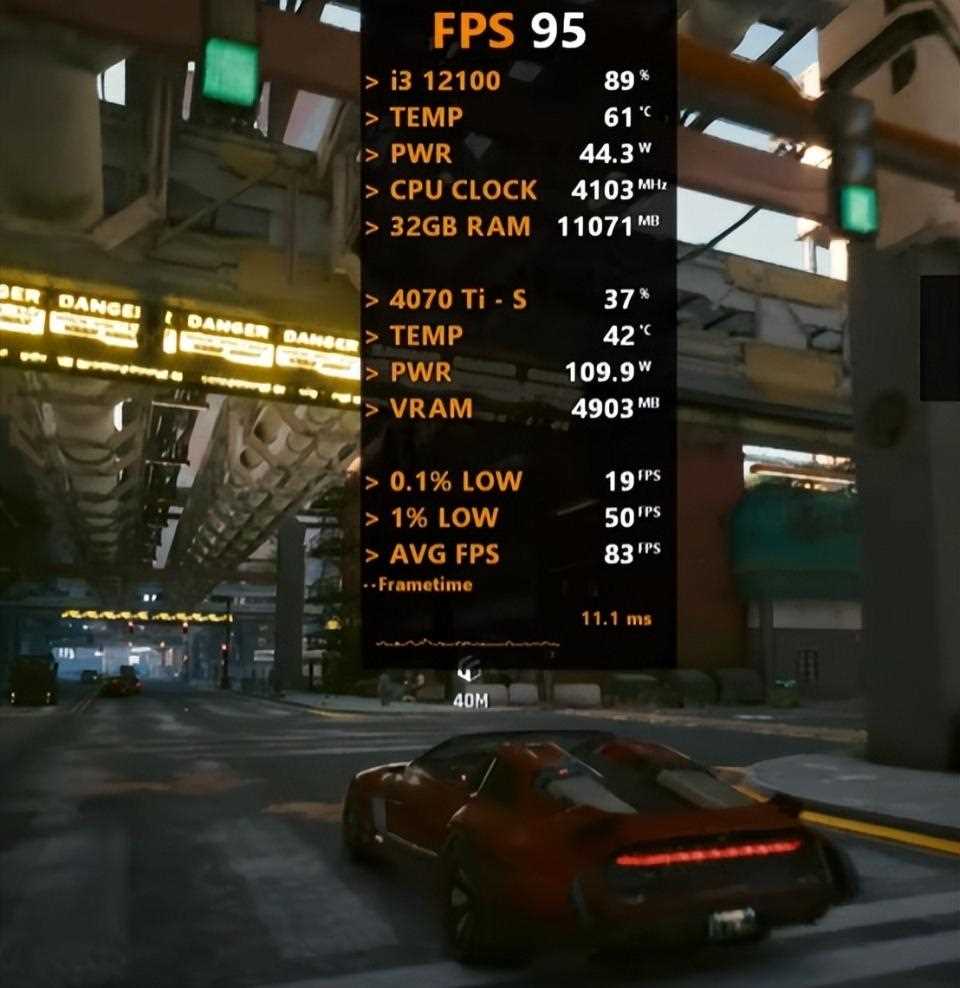 平均帧速为83 FPS,最低瞬时帧速为50 FPS,帧时间为11.1ms,CPU使用率为89%,功耗为44W,温度为61度,内存使用量为11.1GB,GPU使用率为37%,显存使用量为4.9GB,功耗为110W,温度为42度。