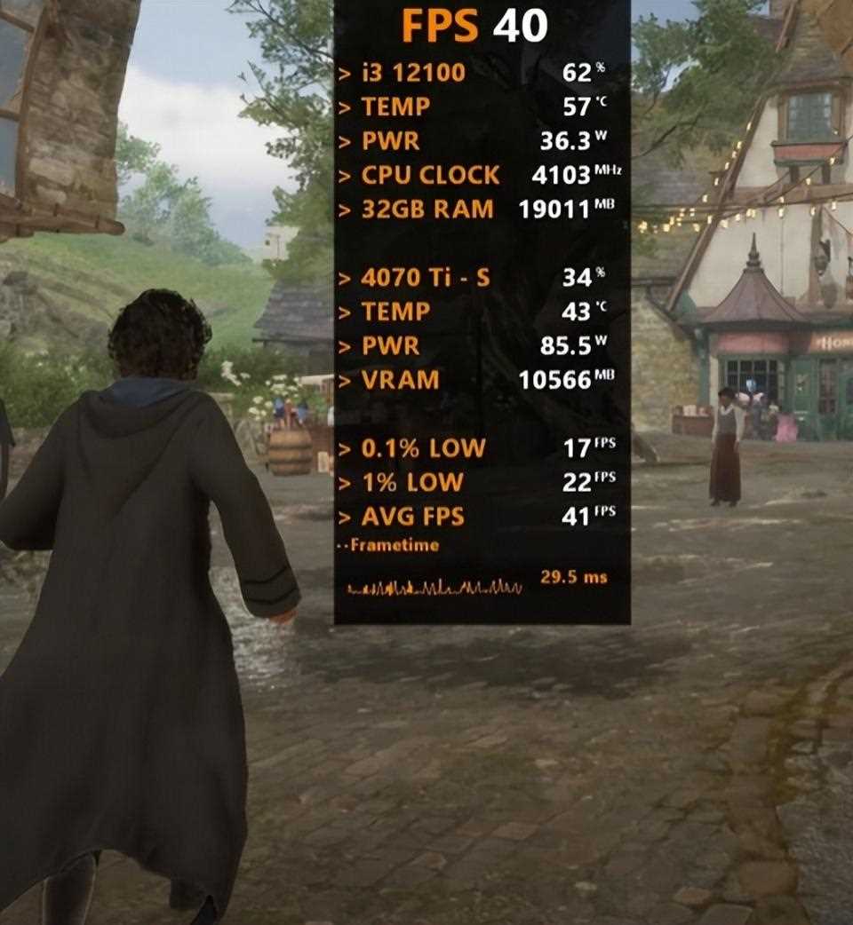 平均帧速为41 FPS,最低瞬时帧速为22 FPS,帧时间为29.5ms,CPU使用率为62%,功耗为36W,温度为57度,内存使用量为19.0GB,GPU使用率为34%,显存使用量为10.6GB,功耗为86W,温度为43度。