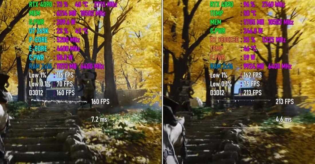 以下将分别测试七款游戏,均采用1080P最高画质模式,以下系列图片中左边代表Core Ultra 7 265K平台,右边代表Ryzen 7 9800X3D平台。