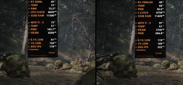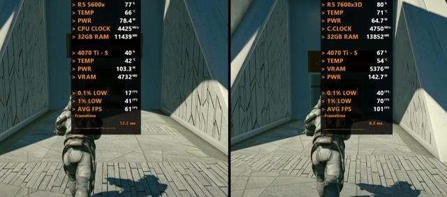 以下将分别测试七款游戏,均采用1080P画质模式,以下系列图片中左边代表Ryzen 5 5600X平台,右边代表Ryzen 5 7600X3D平台。