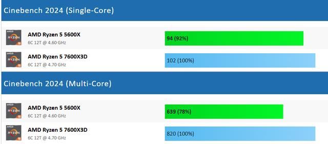 如果对比跑分的话,Ryzen 5 7600X3D的单核性能和多核性能分别比Ryzen 5 5600X高8%和22%左右,单核性能差距并不悬殊。