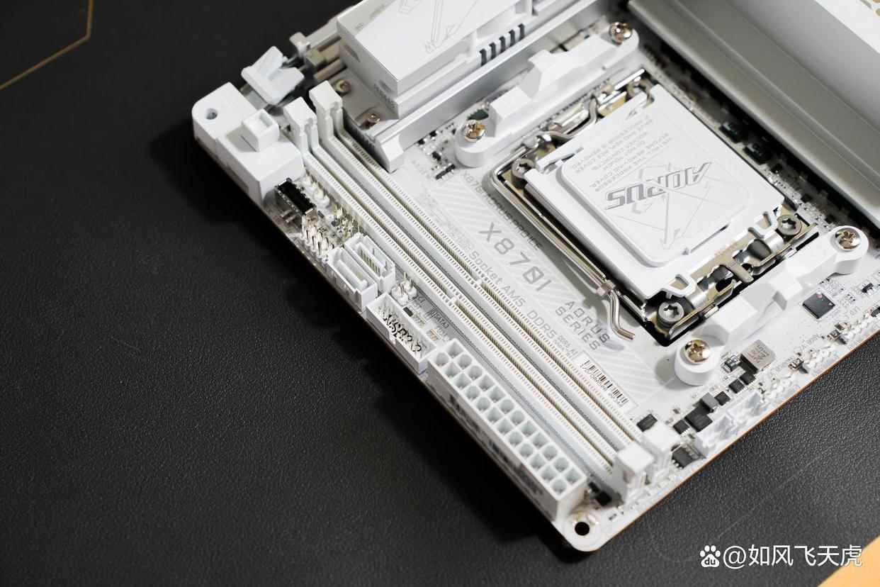 2根DDR5内存插槽,支持8400+MT/s以上的频率,内有内存抗干扰遮罩设计,保护存储信号不受干扰。24PIN主板供电,边上是机箱前置USB-A接口,然后是2个SATA接口,机箱前置面板接口、USB接口、前置面板USB-C接口,以及角落上一个白色的方形按钮,是显卡快拆按钮。