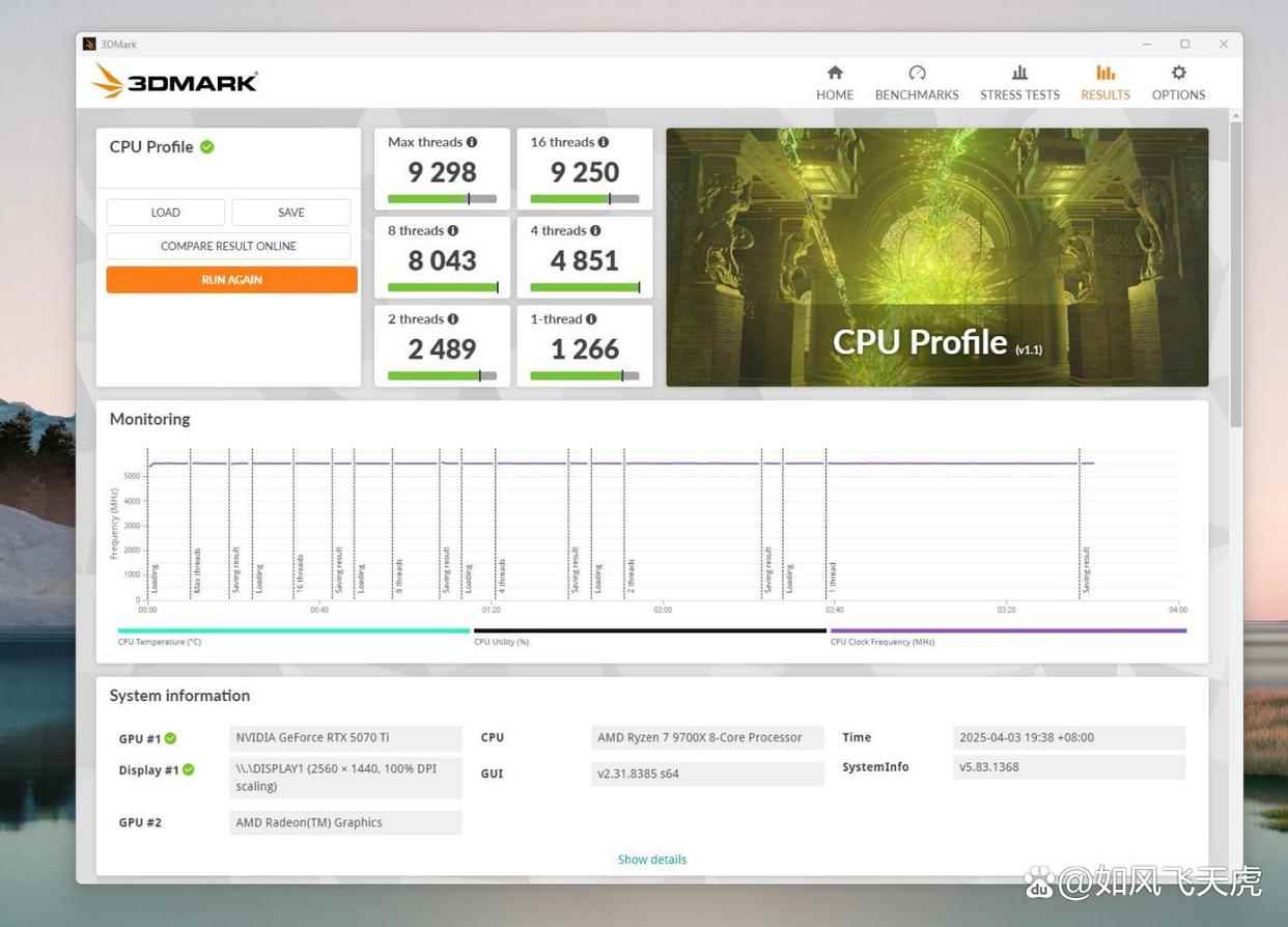 3DMARK CPU Profile测试,单线程1266,多线程9298。