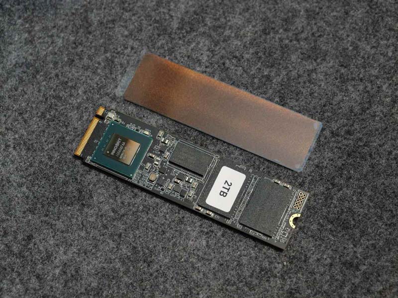 十铨T-FORCE GC PRO采用了自家专利的石墨烯散热片来强化散热,不过在出厂时并没有预先安装,这就方便我们根据自行决定散热方案了,比如在采用拉风的主动式SSD散热器时,芯片直触就要比隔了一层散热片的效果好得多。