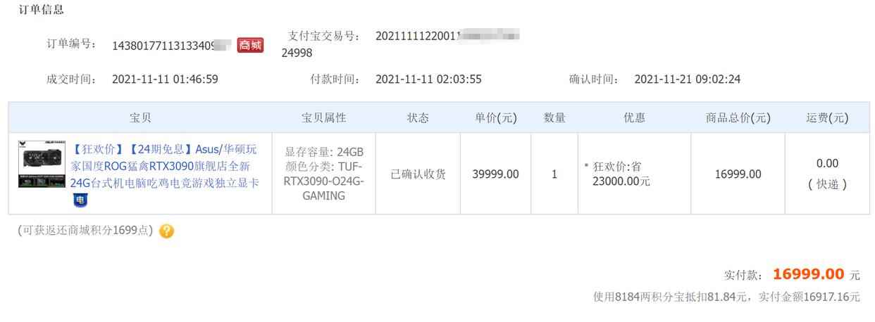 这张显卡我在2021年双12时买到了价格最高点,目前残值也就四五千块钱吧?因为不支持DLSS 3,所以在《黑神话:悟空》等只支持DLSS 3帧生成功能的游戏中会吃大亏,并且光追性能也不如40系的表现。