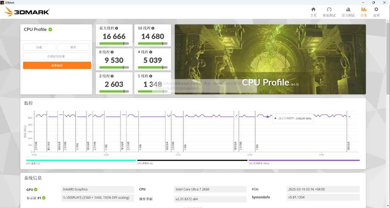 在3DMARK的CPU Profile 的测试中,Intel 265K搭配这张主板,最大线程得分为16666,16 单线程得分为1348分,性能也同样强力。