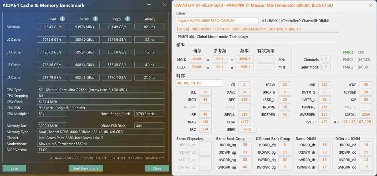 在BIOS将内存直接XMP至8000MHz后,使用AIDA64对内存能效进行测试,测得读取速度为116.43 GB/s,写入速度为93978 MB/s,复制速度为101.49 MB/s,延迟为82.1ns。这个内存读写速率已经非常强了,虽然延迟略高,不过这是Intel 200s处理器的锅,也怪不得主板。